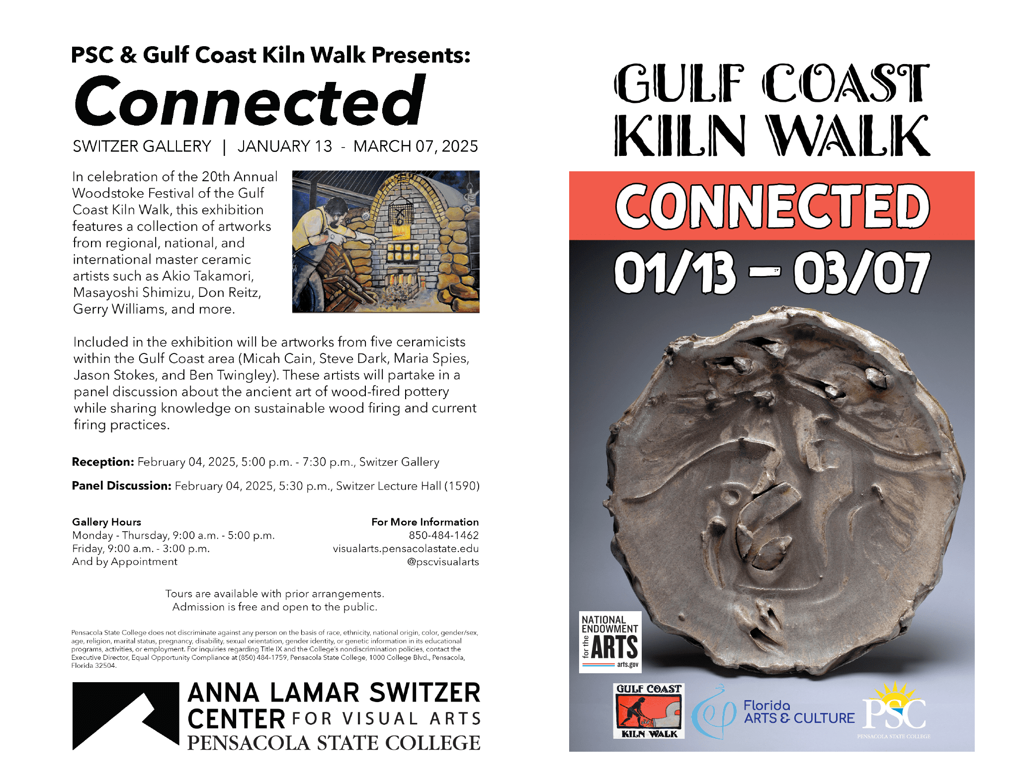 Included in the exhibition will be artworks from five ceramicists within the Gulf Coast area (Micah Cain, Steve Dark, Maria Spies, Jason Stokes, and Ben Twingley). These artists will partake in a live panel discussion about the ancient art of wood-fired pottery on February 04, 2025 starting @ 5:30pm in the Switzer Lecture Hall (Room 1590). A reception will follow, and the event is free and open to the public!